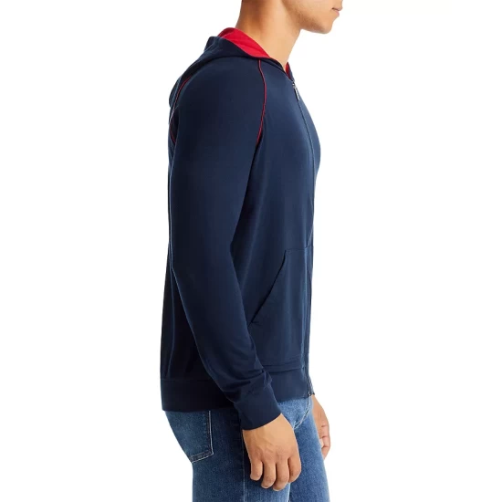 - Long raglan sleeves with contrast piping at shoulders, ribbed cuffs